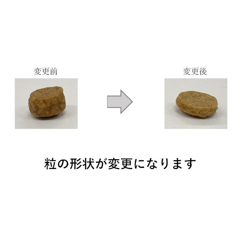 でん粉(タピオカ)、サーモンミール、菜種油、セルロース、フラクトオリゴ糖、ビタミン類(A、D3、E、B1、B2、パントテン酸、ナイアシン、B6、葉酸、B12、C、コリン)、ミネラル類(カルシウム、リン、ナトリウム、カリウム、塩素、マグネシウム、鉄、銅、マンガン、亜鉛、ヨウ素)、アミノ酸類(メチオニン、トリプトファン)、酸化防止剤(ローズマリー抽出物、ミックストフェコロール)、無水ケイ酸