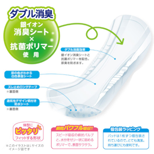 ●材質:【表面材】ポリオレフィン系不織布【防水材】ポリエチレンフィルム【吸収材】吸収紙・綿状パルプ・高分子吸収材【止着材】剥離紙、ホットメルト【結合材】ホットメルト●生産国:日本●サイズ/タイプによってパッケージイラストが違います