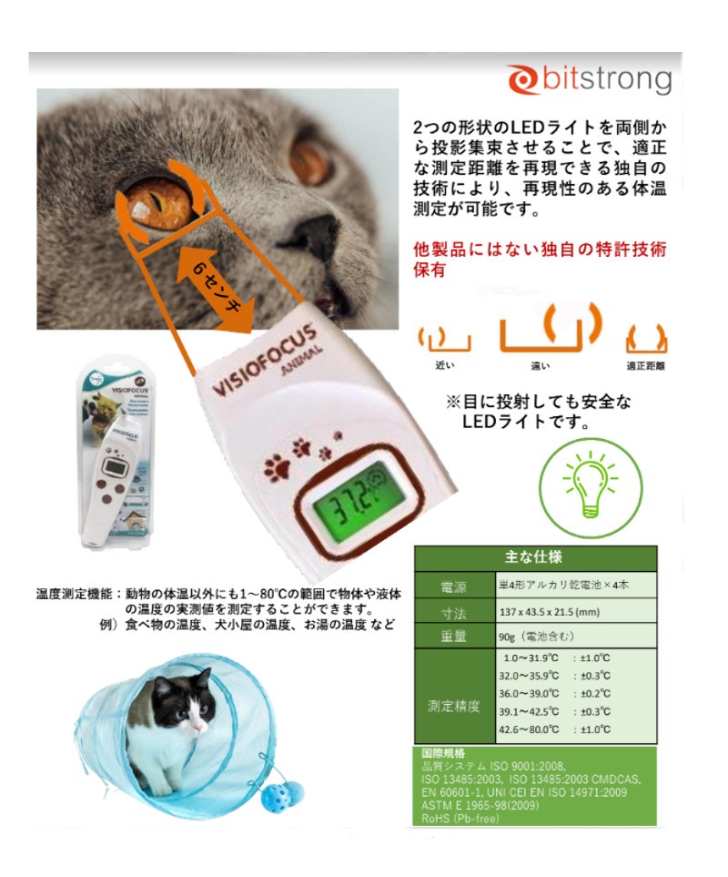 ●目、または他の推奨部位から測定することが可能で、特に目からの体温測定は動物に苦痛や負担をかけずに測定できる全く新しい方法です。