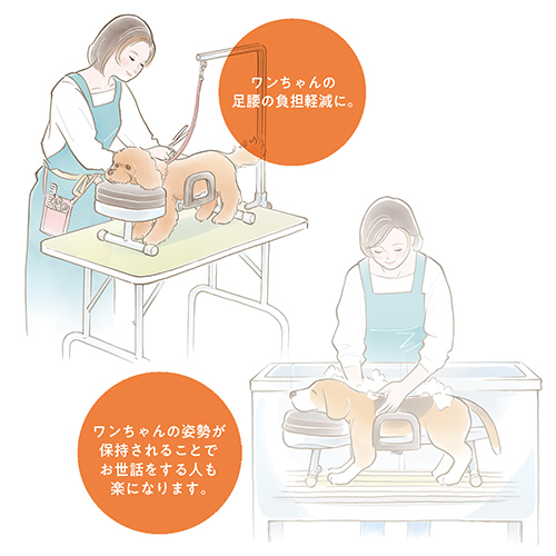 下肢の弱い犬の体を支えて案心グルーミング。シャンプーやトリミングの一人作業を補助します。