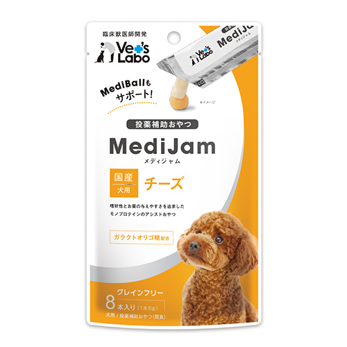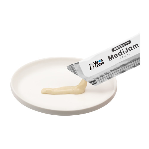 ●メディジャムは粉薬や何かに包み込んでお薬を食べることが苦手なワンちゃんのために臨床獣医師が質感と素材を追求して開発したグレインフリーの投薬補助用おやつです。