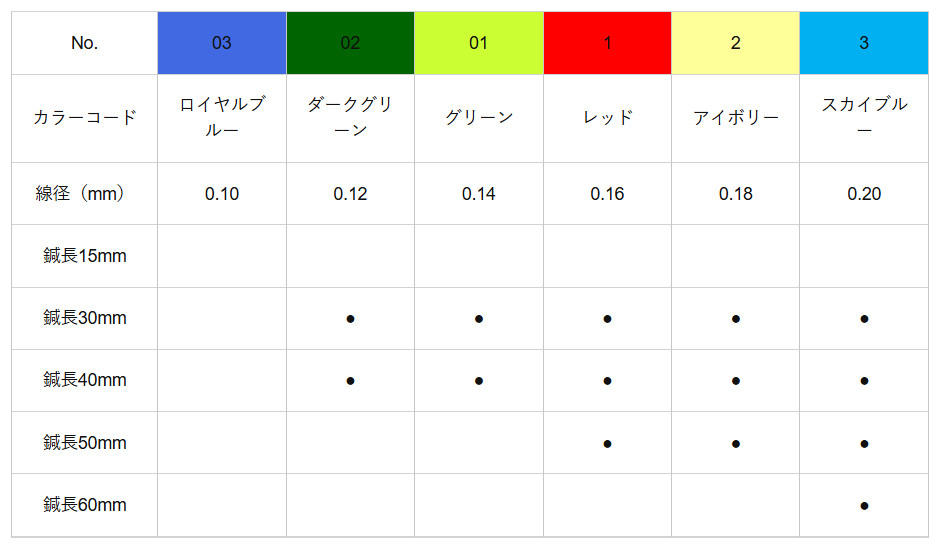 取扱の無い線径・鍼長のご希望がございましたらお気軽にお問合せください。