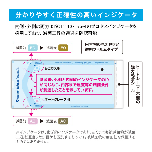 ※インジケータ―は、化学的インジケーターであり、あくまでも被滅菌物が滅菌工程を通過したか否かを区別するものです。被滅菌物の無菌性を保証するものではありません。