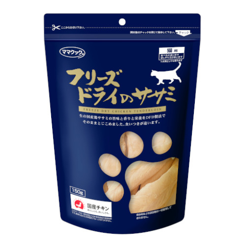 ●鶏ササミは鶏肉の中で最も高タンパクで低脂質です。減量中のねこちゃんにもおすすめです。素材のままの味、香り、栄養を損なわないのは弊社独自のフリーズドライの特徴です。原材料調達から加工・包装まで、全て国内で行っておりますので安心してご利用ください。