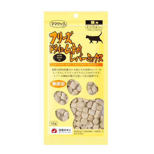 ●嗜好性が高く、そのまま与えられるフリーズドライのおやつです。成型の為のツナギなどは使用せず、新鮮な鶏ムネ肉と鶏レバーのみの完全無添加で仕上げています。潰してトッピングとしてもご使用いただけます。素材のままの味、香り、栄養を損なわないのは弊社独自のフリーズドライの特徴です。原材料調達から加工・包装まで、全て国内で行っておりますので安心してご利用ください。