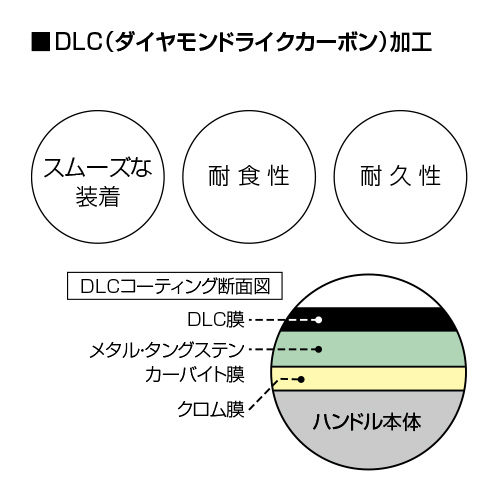 ハンドル表面にDLC(ダイヤモンドライクカーボン)加工を施すことで、ハンドルの防錆・耐久性が向上