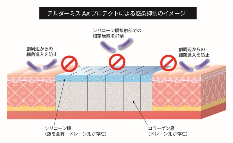 ●従来品テルダーミスのシリコーン膜に銀を配合。銀イオンの効果によって抗菌性が期待できます。