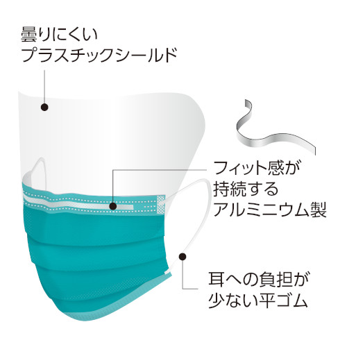 ●耳ひもは耳への負担が少ない平ゴムで、ポリエステル製(ラテックスフリー)のためアレルギーの方も安心です。