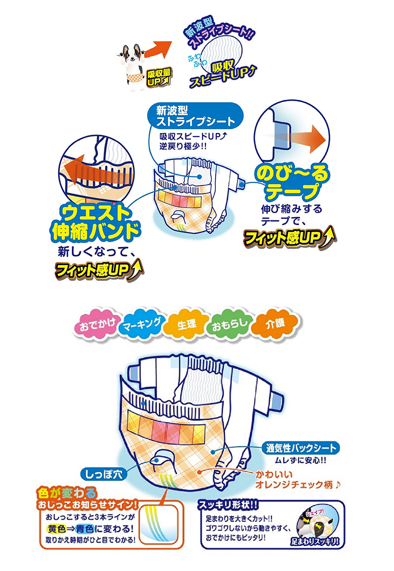 ペット業界初の伸縮性の良いのび〜るテープを採用し、フィット感UP!ウエストバンドも新素材でフィット感UP!新波型ストライプの表面材を採用し、吸収スピードUP!逆戻り極小!吸水力、消臭力UP!