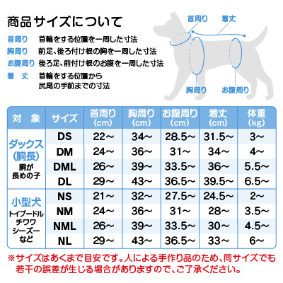 ●大きめを選ぶと、手足が脱げやすくなる原因になります。ワンちゃんの体型に合ったサイズをお選びください。