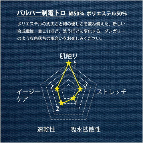 ●「パルパー制電トロ」素材は汗を吸い取りやすく、ナチュラルなストレッチを効かせた、着こむほど、洗うほどに変化する、人気素材。