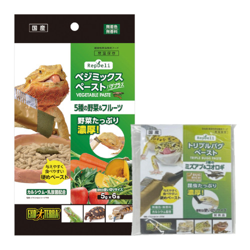 ●栄養たっぷりなニンジン・インゲン・カボチャ・モロヘイヤ・リンゴをミックスした野菜メインのペーストに、嗜好性の高いアメリカミズアブ幼虫・ヨーロッパイエコオロギ・フタホシコオロギをプラス。様々な栄養を摂取でき、雑食性の生体の栄養バランスアップに最適です。