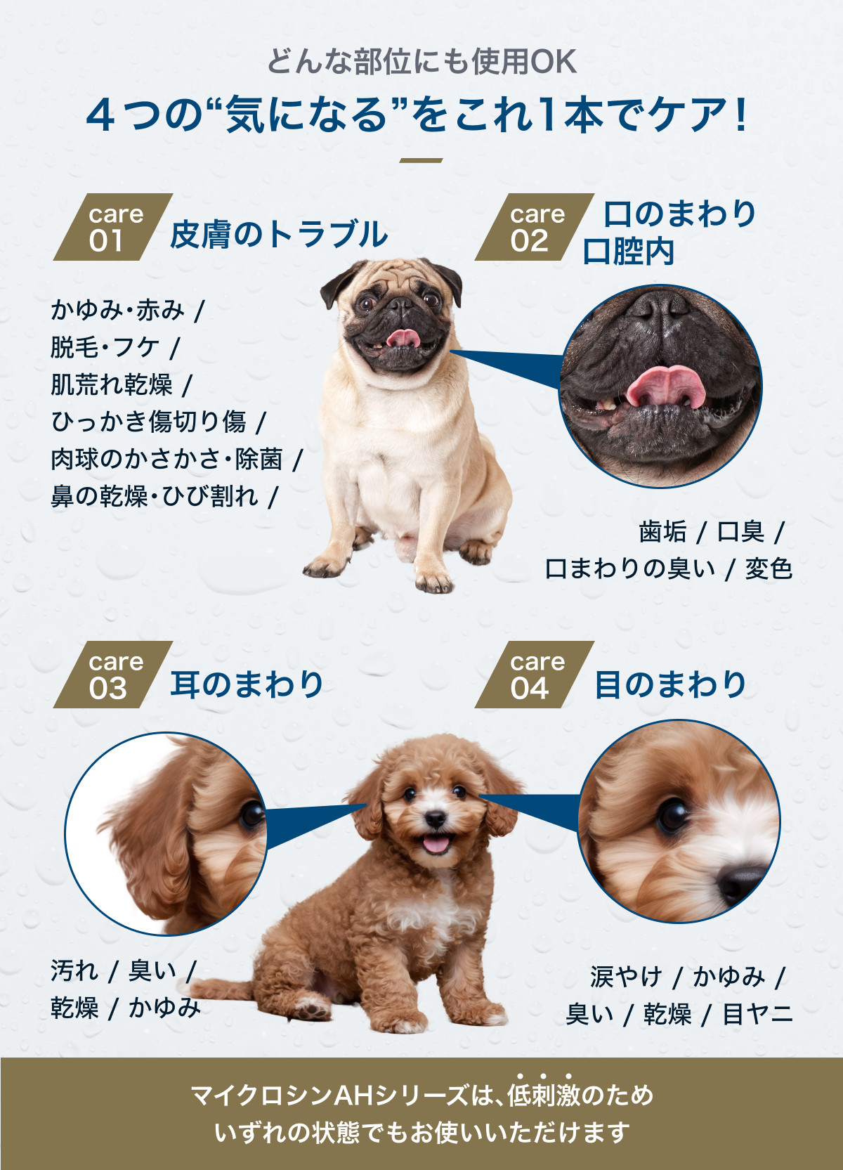 ●除菌と保湿に。皮膚、目のまわり、耳のまわり、口腔内のケアに使えます。