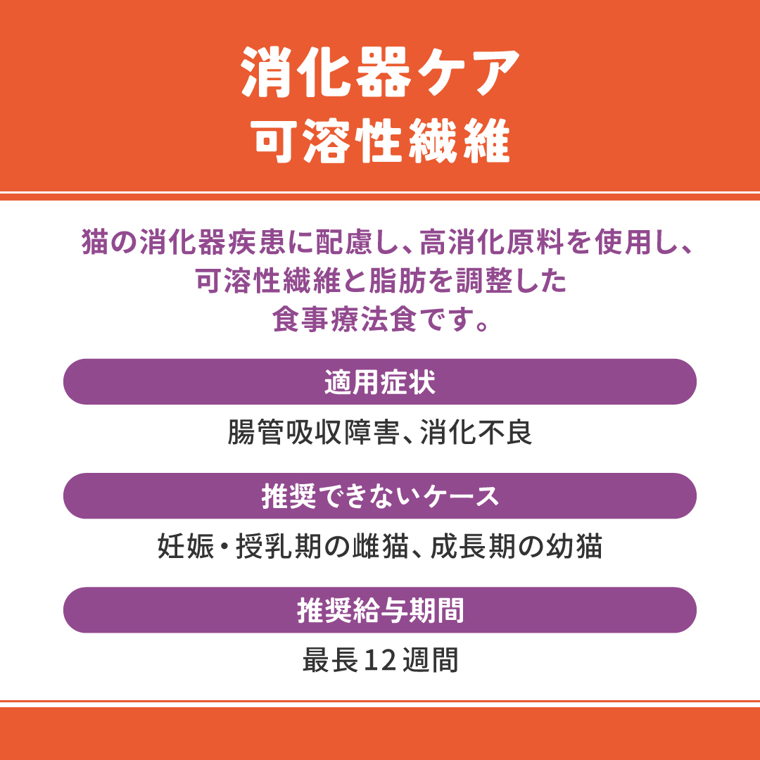 ● 猫の消化器疾患に配慮し、高消化原料を使用し、可溶性繊維と脂肪を調整した食事療法食
