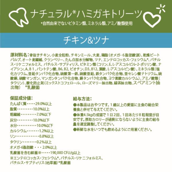 ●骨抜きチキン、小麦全粒粉、チキンミール、大麦、鶏脂(オメガー6脂肪酸源)、乾燥ビートパルプ、オート麦繊維、クランベリー、たん白加水分解物、ツナ、エンテロコッカス・フェシウム*、バチルス・リケニフォルミス、 バチルス・サブティリス、ビタミン類(コリン、E、L−アスコルビル−2−ポリリン酸、ナイアシン、A、B1、パントテン酸、B6、B2、ビオチン、D3、B12、葉酸、L−アスコルビン酸)、ミネラル類(塩化カリウム、亜鉛タンパク化合物、硫酸第一鉄、硫酸亜鉛、鉄タンパク化合物、亜セレン酸ナトリウム、硫酸銅、硫酸マンガン、マンガンタンパク化合物、銅タンパク化合物、ヨウ素酸カルシウム)、アミノ酸類(タウリン)、酸化防止剤(ミックストコフェロール、ローズマリー抽出物、緑茶抽出物、スペアミント抽出物)*乳酸菌