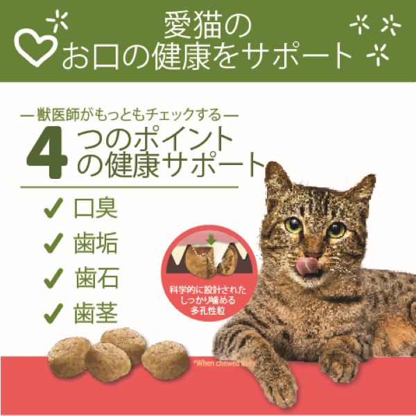 科学的に設計されたしっかり噛める多孔性粒が特長の猫用ハミガキおやつ。乳酸菌・クランベリー配合。