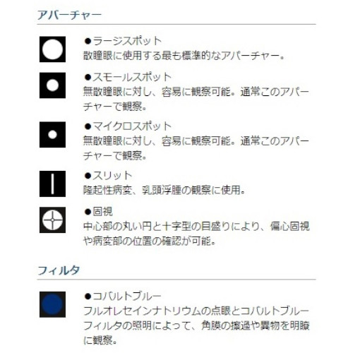 アパーチャー:マイクロスポット、スモールスポット、ラージスポット、固視、スリット