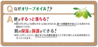 ●天然オリーブオイルを配合し、水分もたっぷり含んでいるため、便などのがんこな汚れもするっと簡単に落とすことができます。