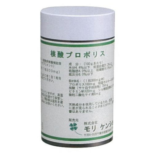 (1粒300mg中)プロポリス40g、核酸(サケ白子抽出物)70g、ビタミンMIX20g
