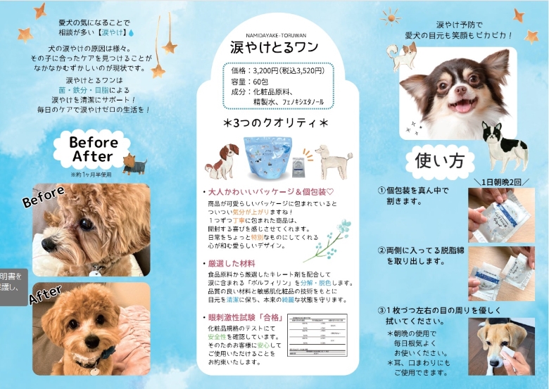 「鉄分」「菌」「目脂汚れ」のお悩みすべてに対応する涙やけケアシートです。