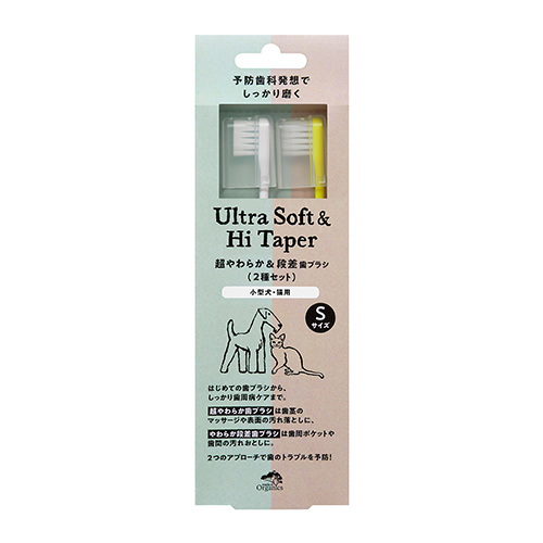 【超やわらか歯ブラシ】 ・従来の歯ブラシでは用いられなかった超極細毛を採用。 ・気持ちよく歯の表面と歯間の汚れをしっかり落とします。 ・マッサージ効果で、口内環境を整えます。 【やわらか段差歯ブラシ】 ・二段植毛が、汚れのたまりやすい歯と歯ぐきの間に入りこみ歯周病と口臭を予防。 ・やわらか段差歯ブラシは、2段植毛が歯と歯ぐきのすき間にしっかり届き、汚れを除去します。 ・歯列が乱れがちな短頭種でもしっかり磨けます。
