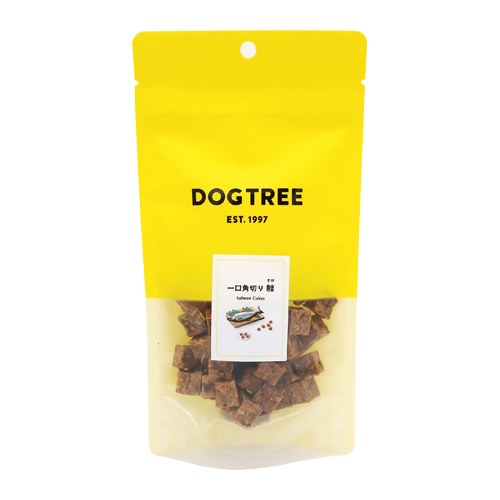 国産無添加の鮭を一口サイズの角切りに形成した食べやすいおやつ。鮭にはビタミン(特にビタミンD)やアスタキサンチン、その他ミネラルなどが豊富で、ご褒美用おやつやフードのトッピングにも最適。小型〜中型犬向き。