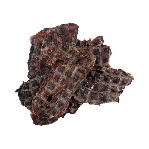 国産天然鹿の肉(ジビエ)を独自製法で乾燥させスライス。鹿肉は低カロリー・高タンパク・低脂肪で、鉄分やビタミンB2が豊富。手で簡単に折ることができるほどよい硬さ。ご褒美用おやつとしても、フードのトッピングとしても最適。