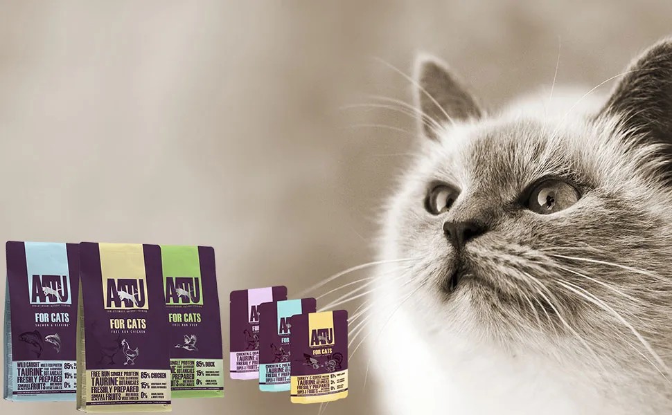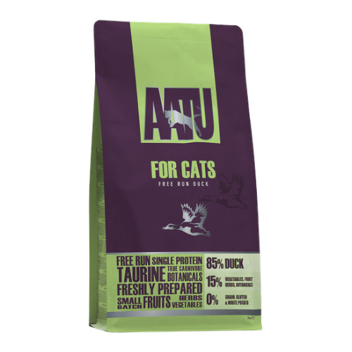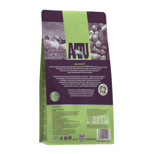 AATUシリーズは上質な肉食ダイエットを好む愛猫のために肉(魚)85%(愛猫用)と15%(愛猫用)の野菜、フルーツ、ハーブ、植物由来原料をふんだんに使用した100%ナチュラルなグレインフリー(穀物不使用)キャットフードです。