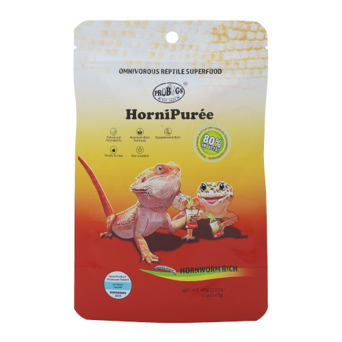 ホーンワーム(34%)、ミルワーム(30%)、ミズアブ幼虫(22%)、小麦粉、キサンタンガム、ビーポーレン、クエン酸、海藻粉末、塩化コリン、ビタミン類(E、C、B5、B2、A、B1、B69)、ナイアシン、葉酸、ビタミンD3、ビオチン、タウリン、ミネラル類(Ca,P,Fe,Mg,Zn,Mn,Cu)