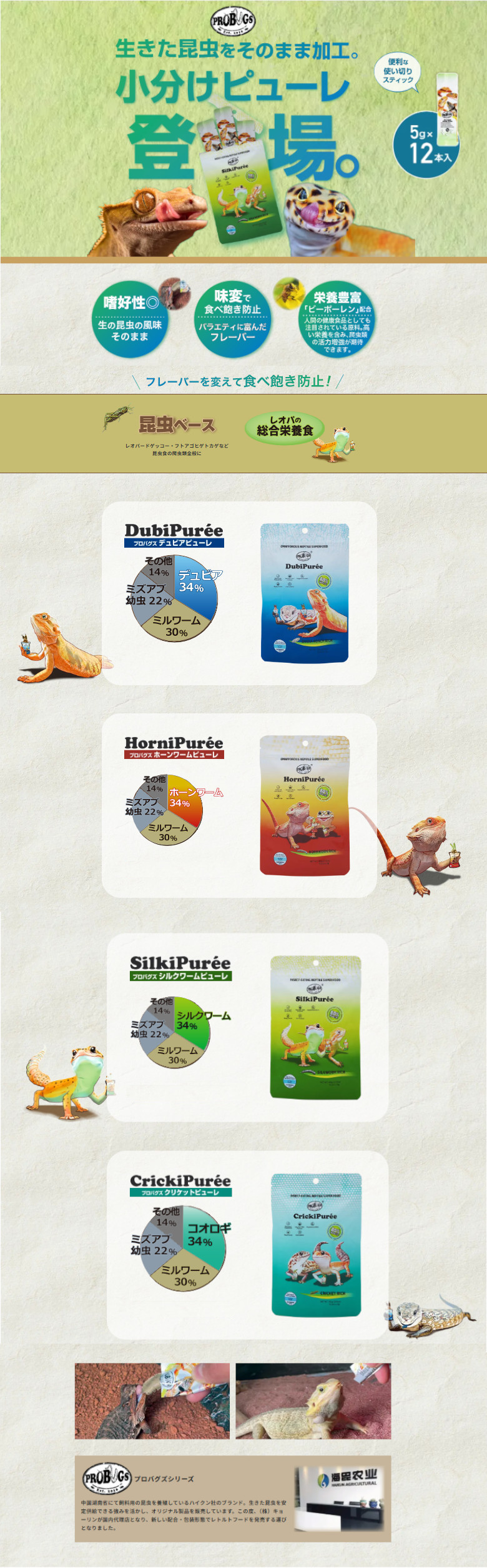 デュビア(34%)、ミルワーム(30%)、ミズアブ幼虫(22%)、小麦粉、キサンタンガム、ビーポーレン、クエン酸、海藻粉末、塩化コリン、ビタミン類(E、C、B5、B2、A、B1、B6)、ナイアシン、葉酸、ビタミンD3、ビオチン、タウリン、ミネラル類(Ca,P,Fe,Mg,Zn,Mn,Cu)