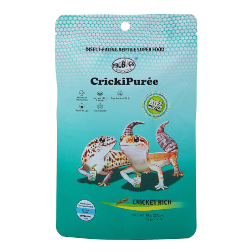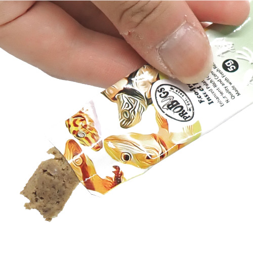 デュビア(34%)、ミルワーム(30%)、ミズアブ幼虫(22%)、小麦粉、キサンタンガム、ビーポーレン、クエン酸、海藻粉末、塩化コリン、ビタミン類(E、C、B5、B2、A、B1、B6)、ナイアシン、葉酸、ビタミンD3、ビオチン、タウリン、ミネラル類(Ca,P,Fe,Mg,Zn,Mn,Cu)