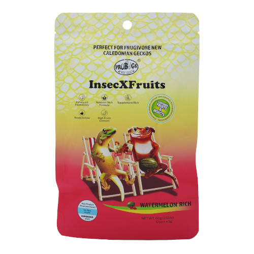 スイカパウダー(48%)、ミルワーム(32%)、バナナパウダー(18%)、小麦粉、はちみつ粉末、ビーポーレン、クエン酸、海藻粉末、塩化コリン、ビタミン類(E、C、B5、B2、A、B1、B6)、ナイアシン、葉酸、ビタミンD3、ビオチン、タウリン、ミネラル類(Ca,P,Fe,Mg,Zn,Mn,Cu)