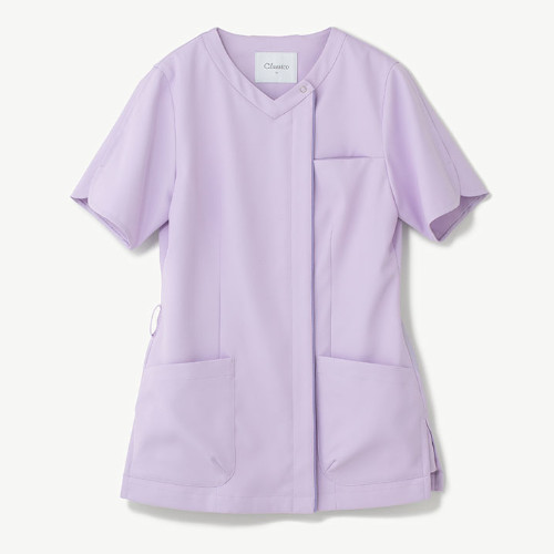 すっきりと美しい印象のVネックデザインスクラブトップス。