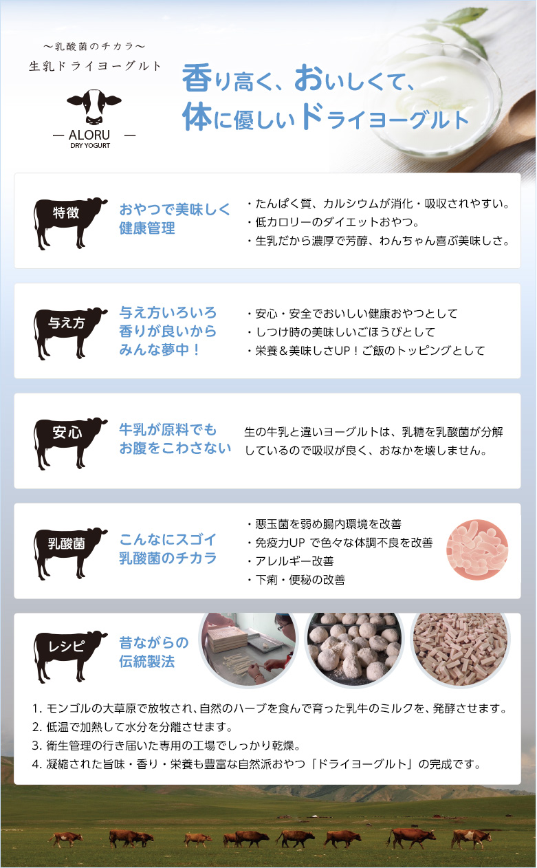新鮮な生乳を原材料に、モンゴル伝統の製法をもとに無塩・無糖・無添加でつくった体に優しいおやつです。