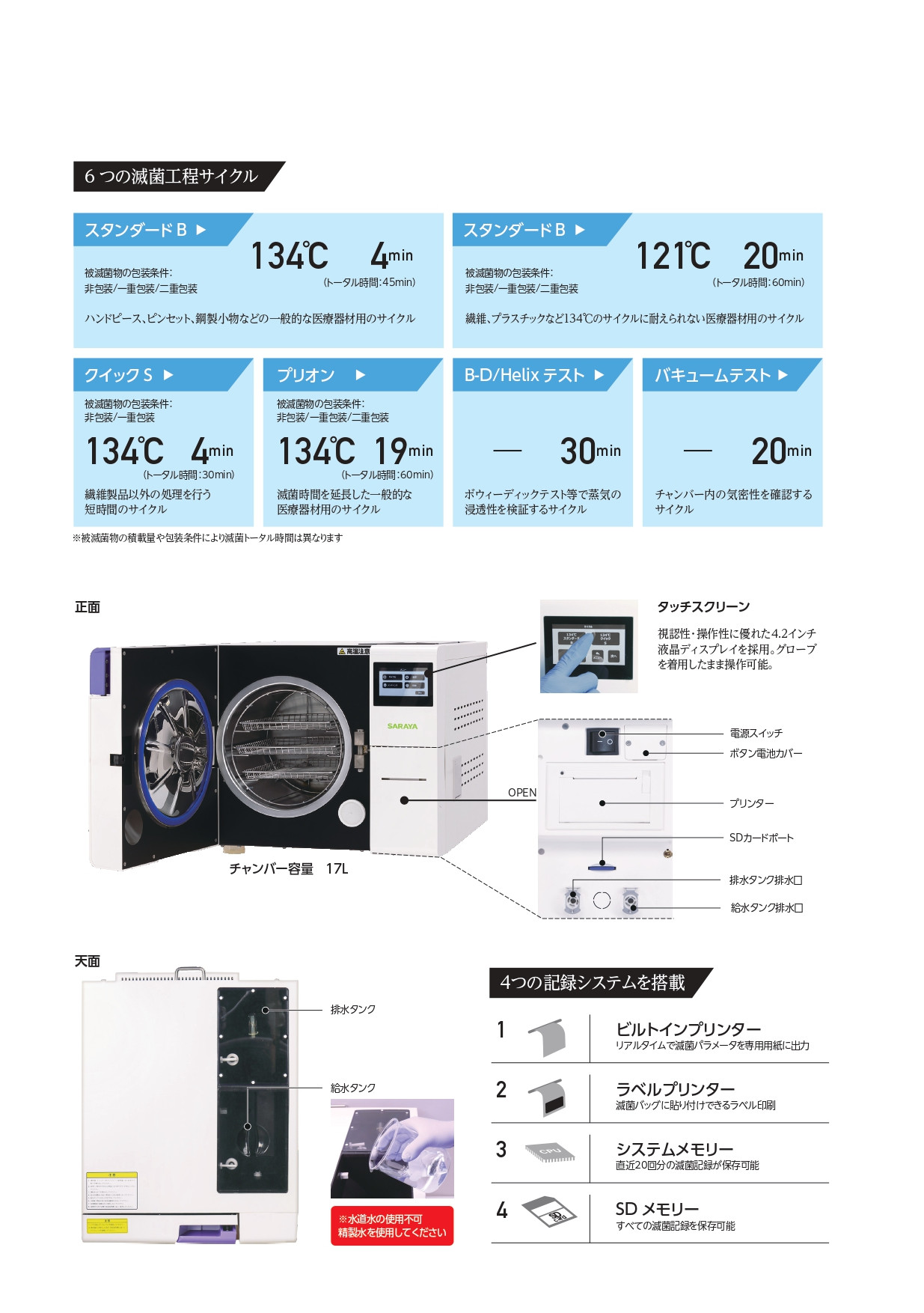 滅菌情報を自動印刷/滅菌情報のラベルを印刷可能/本体に直近20件の記録を自動保存/SDカード(非付属)に記録可能
