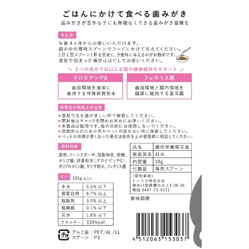 ●澱粉、コーンスターチ、脱脂粉乳、粉糖、オリゴ糖、卵黄粉末(グロビゲンPG)、ポリグルタミン酸、カツオ粉末、フェカリス菌