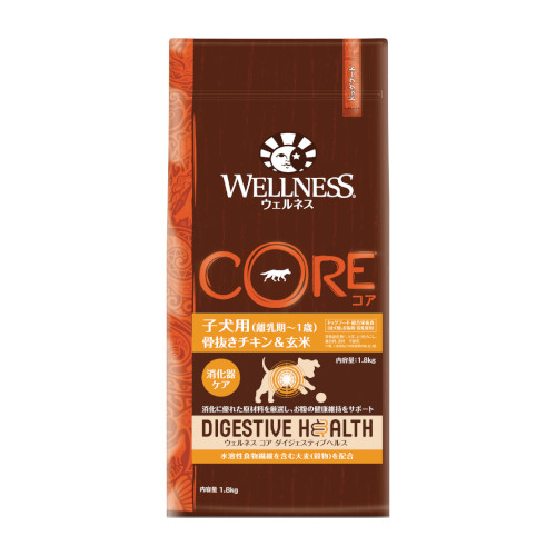 《ウェルネスコアダイジェスティブヘルスは、犬猫の祖先は肉食であるという栄養学的哲学をもとに、消化に優れた原材料を厳選し、高消化性に設計された消化管の健康に配慮した製品です。お腹の健康維持をサポートします。水溶性食物繊維を含む大麦(穀物)を配合》