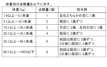 犬の体重に応じて1〜8滴を片目もしくは両目に点眼する。