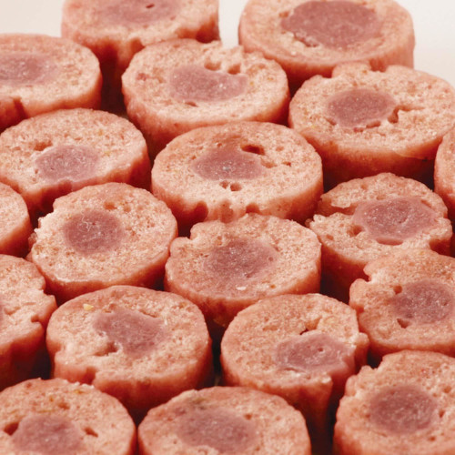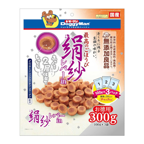 ●原材料(成分):肉類(鶏胸肉、鶏ササミ、鶏レバー、鶏肉)、小麦粉、糖類、コーンスターチ、タピオカでん粉、調味料、コラーゲンペプチド、軟骨抽出物(コンドロイチン含有)、グリセリン、トレハロース、ソルビトール、膨張剤、リン酸塩(Na、K)、ミネラル類(ナトリウム)、着色料(クチナシ)、グルコサミン