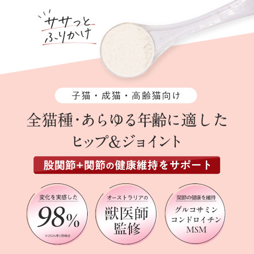 ●グルコサミンやコンドロイチン、MSM(メチルサルフォニルメタン)などの成分を摂取することで愛猫の健康を維持し、股関節と関節の健康維持をサポートします。