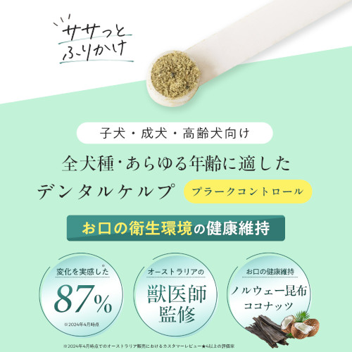 ●お口の臭いや歯の健康維持をサポートするノルウェー昆布とココナッツを配合。ココナッツの風味で、歯磨きが苦手なワンちゃんも手軽にデンタルケアができます。