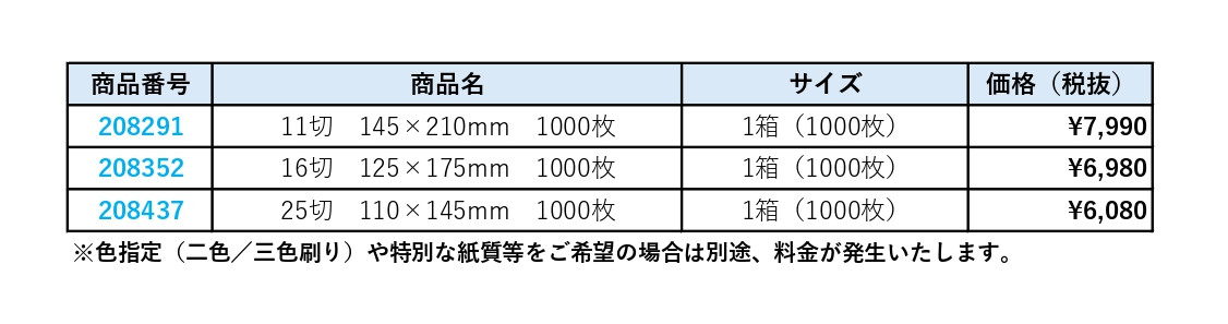 ・色指定(二色/三色刷り)や特別な紙質等をご希望の場合は別途、料金が発生いたします。