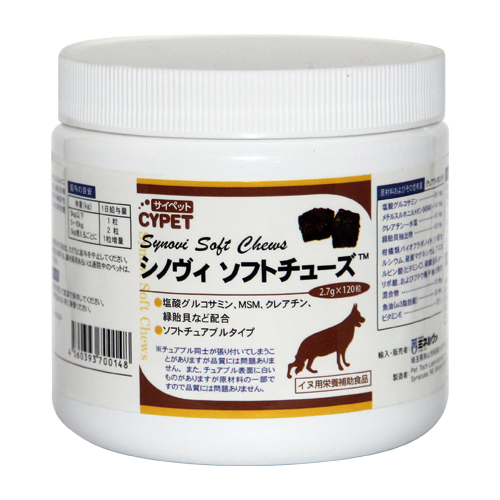 ●塩酸グルコサミン、メチルスルホニルメタン(MSM)、クレアチン一水塩、緑貽貝抽出物、EPA、DHA、乳清、蔗糖、ビーフ風味(植物タンパク質加水分解物)、レバー風味、大豆油、柑橘類フラノボイド、リン酸カルシウム、硫酸マンガン、硫酸亜鉛、αリポ脂肪酸、ブドウ種子抽出物、セレン、ビタミンC、E二酸化ケイ素、ステアリン酸マグネシウム